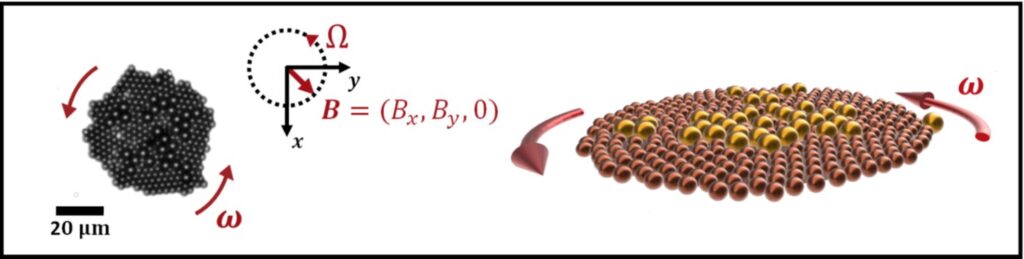 Experimental image and schematic representation of a self-assembled binary colloidal cluster which rotates under an influence of in-plane rotating magnetic field.