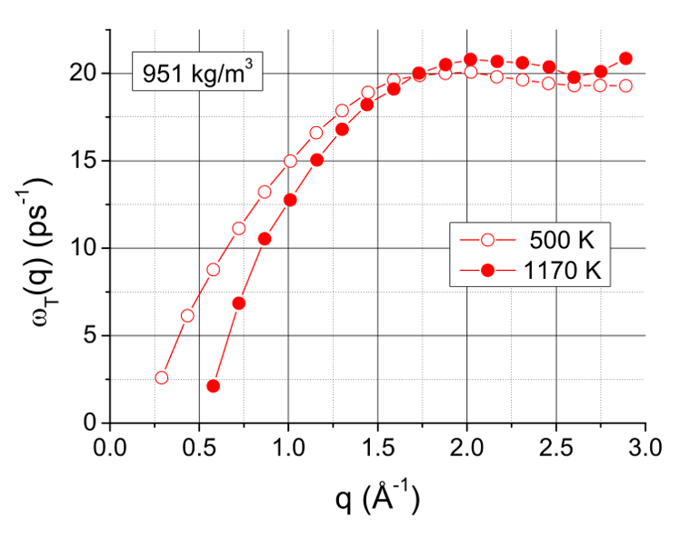 Dispersion curves calculated for transversal excitations in liquid sodium at two values of temperature