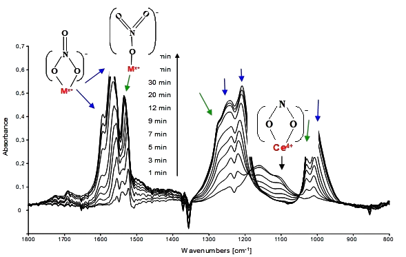 Une activité transverse porte sur la détection par spectroscopie in situ (IR/DRIFTS, UV-Vis…) des intermédiaires de la catalyse et l’élaboration de mécanismes réactionnels.