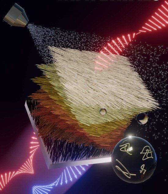 Cette figure représente des empilements anisotropes et chiraux bioinspirés (les insectes et les crevettes présentent naturellement ce type de structures) afin de réaliser des filtres d’états de polarisation. Les matériaux qui constituent chaque couche sont des nanofibres de cellulose orientées et déposées par spray couplé à une technique de dépôt couche par couche (technique développée par G. Decher de l’Institut Charles Sadron de Strasbourg). Bien que les films soient transparents, le dépôt agit comme un filtre de Bragg sélectif en polarisation circulaire. Dans ce travail, l’équipe a mené la caractérisation par ellipsométrie et la modélisation de la réponse optique de ces films nanocomposites. Ce travail constitue un bel exemple représentatif de l’application de l’ellipsométrie et de la modélisation aux structures non conventionnelles.