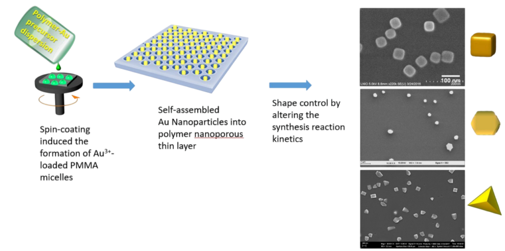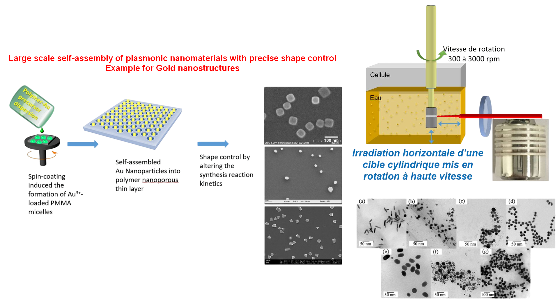 Ce schéma illustre sur la thématique « synthèse par auto-assemblage ». Des nanostructures plasmoniques à bases de nanoparticules d’or sont élaborées avec un contrôle précis de leurs tailles et de leur morphologies par auto-assemblage sur une large surface. Ces nanostructures trouvent des application dans la détection et la photocatalyse plasmonique. L’image ci-jointe illustre les différentes étapes du procédé de synthèse.