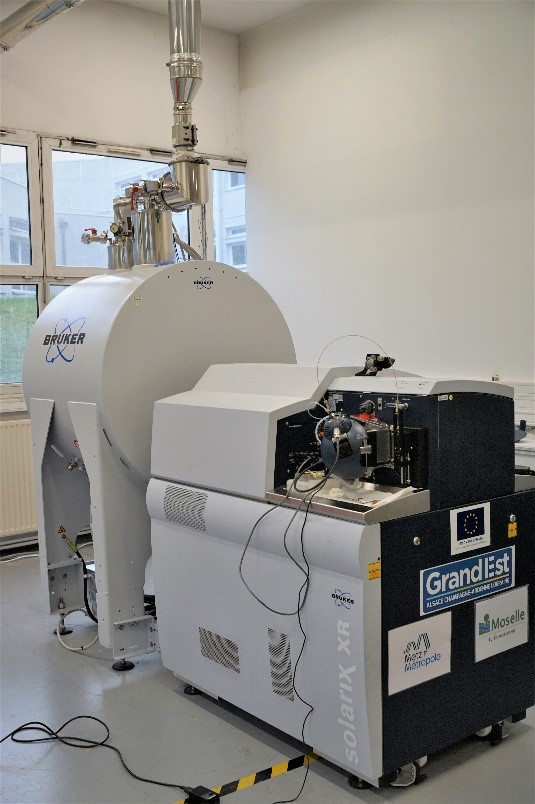 Le spectromètre Solarix 7T 2XR FTMS (Bruker) bénéficie des améliorations technologiques les plus récentes et permet d’obtenir des performantes jusqu’alors inégalées. Il assure la mesure simultanée de dizaine de milliers d’espèces avec une précision sur la mesure de masse équivalente à quelques pourcents de la masse d’un électron pour une molécule d’une centaine d’atomes et avec une résolution extrêmement élevée (20 000 000).