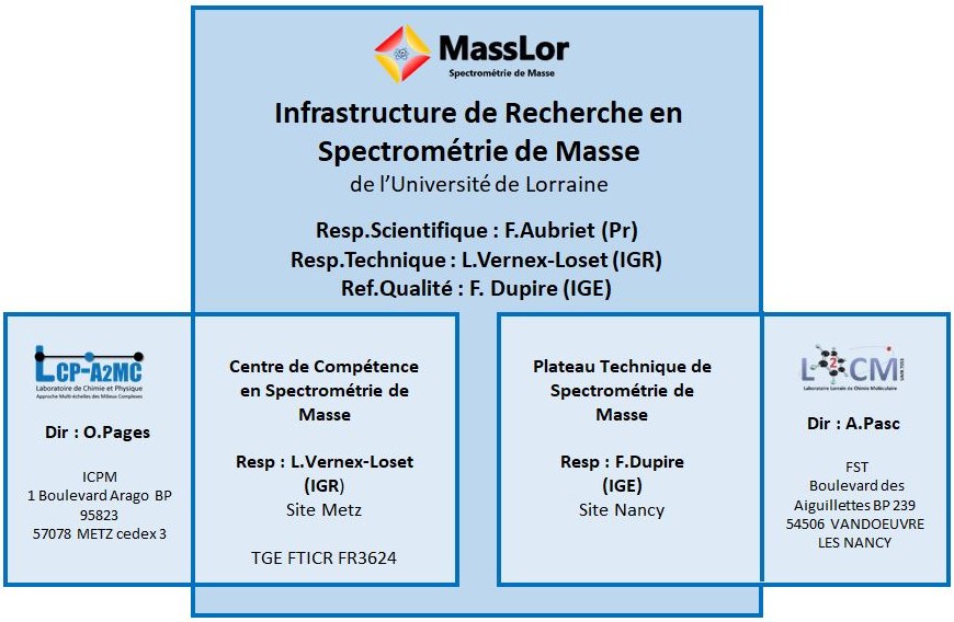 Pour en amplifier l’impact structurant et l’offre de service, le projet d’Infrastructure de Recherche MassLor a été porté en commun avec le Service de Spectrométrie de Masse du L2CM de Nancy qui possède lui aussi une longue expérience dans le domaine de l’analyse par spectrométrie de masse. Elle regroupe ainsi deux plateformes du pôle Scientifique CPM.
