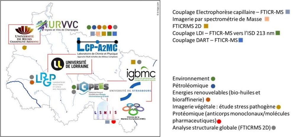 Un consortium reposant principalement sur six laboratoires de notre territoire (deux de l’Université de Lorraine, trois de l’Université de Strasbourg et un de l’Université de Reims) a été créé, il ouvre le champ aux développements de nouvelles méthodologies d’analyse par spectrométrie de masse d’extrême résolution (couplage à l’électrophorèse capillaire, expériences FTICRMS 2D pour l’analyse structurale, imagerie, source d’ionisation laser multi-longueurs d’onde) et à leurs applications dans les domaines de l’environnement, de l’énergie (pétrole, bio-carburant, bioraffinerie) et de la biologie tant animale, en particulier humaine, que végétale.