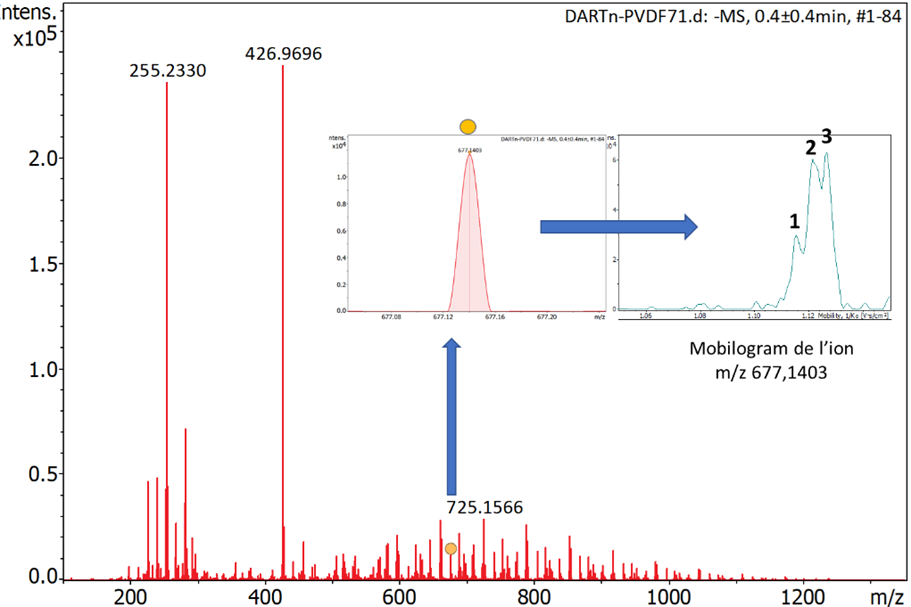 Une seconde étude, d’un polymère de polyfluorure de vinylidène (PVDF) par ionisation DART (Direct Analysis in Real Time), a déjà démontré la complémentarité de cette technique Tims TOF avec une autre technique phare de la plateforme MassLor, la spectrométrie de masse à très haute résolution FT-ICR MS. Comme le montre la figure 2, la mobilité ionique permet de mettre en évidence la présence, pour l’ion m/z 677,1403, de 3 isomères ou conformères que la FT-ICR MS ne permet pas de distinguer car ayant la même formule chimique. Ces informations permettent d’avoir une meilleure compréhension de la composition moléculaire de milieux complexes.