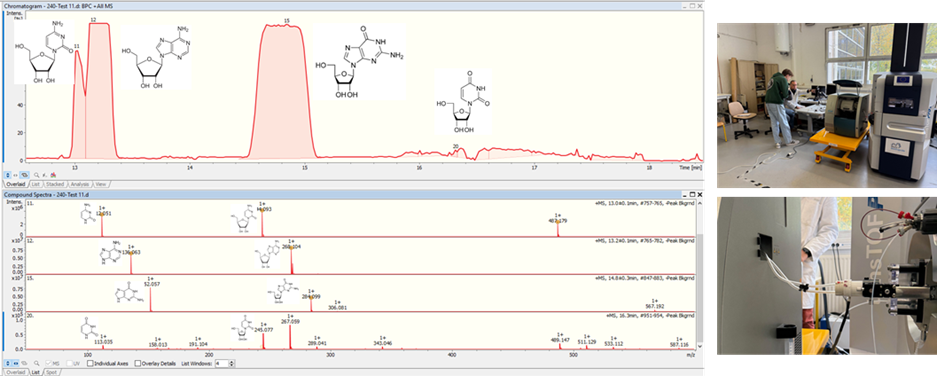 Un stage de M2, qui a débuté le 13/10/2025, va étudier le couplage électrophorèse capillaire – spectrométrie de masse à temps de vol avec mobilité ionique, pour le profilage métabolique de microorganismes. Ce type de couplage à la spectrométrie de masse, qui est peu courant, nécessite une forte expertise. Les premiers résultats (Fig 1) sont très encourageants comme le montre l’analyse d’un mélange de 4 nucléosides (précision de mesure en masse de 1,5 ppm en calibration externe).